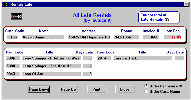 This window shows all rentals which are currently late, along with information relevant to the customer that has rented these tapes.