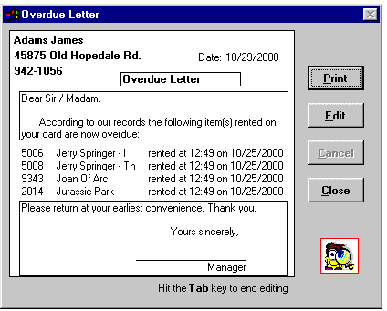 If you need to prompt a particular customer to return them, you can also print from here an Overdue Letter.